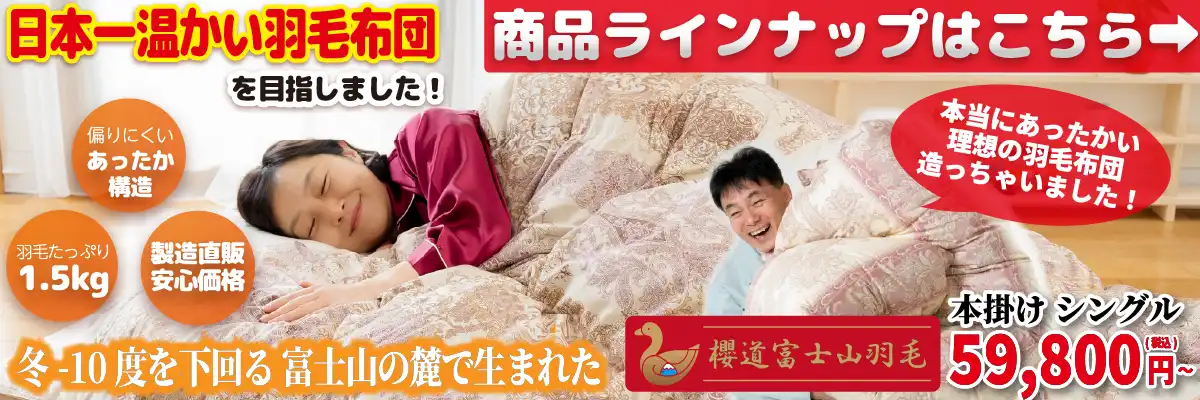 地元のお客様だけではなく、全国のお客様のお声を元に、当店の羽毛布団をさらなる高みへと進化させるべく、当店が考える"理想の羽毛布団"と、お客様の"本当に温かくて私にちょうどいい"を追求して生まれたのが「櫻道富士山羽毛」なのです。